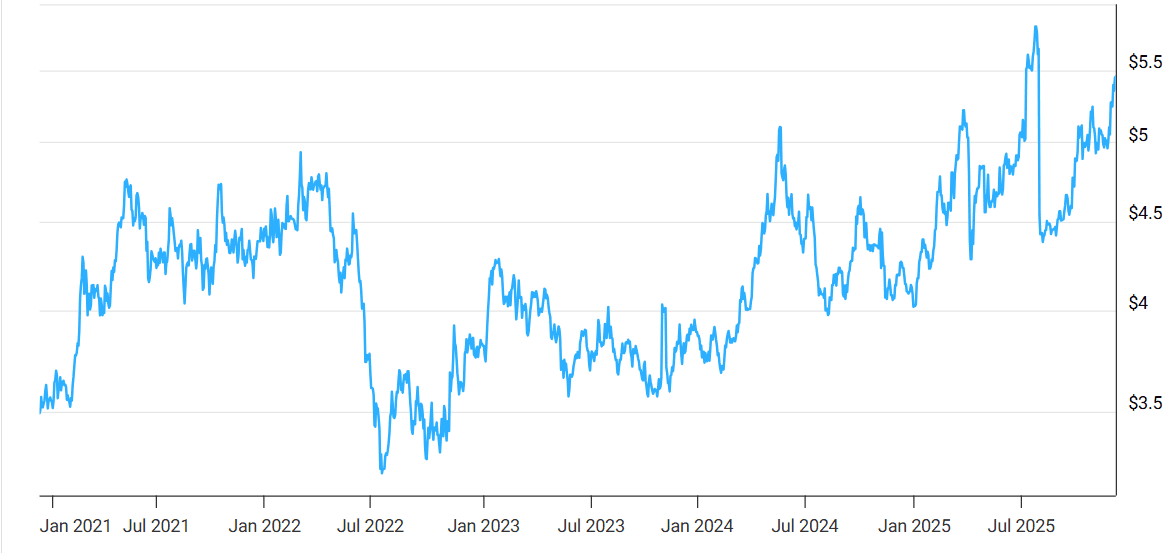 V listopadu 2025 se měď obchoduje za 10 943,75 USD za tunu na Londýnské burze kovů (LME), což odpovídá 228 887 Kč za tunu. V říjnu 2025 dosáhla historického maxima 11 200 USD za tunu. Aktuální cena je jen 2,6 % pod tímto maximem, což ukazuje na silný rostoucí trend.
