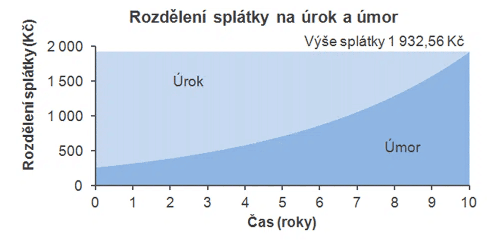Pokud máte tedy například spotřební úvěr na 10 let s měsíční splátkou 2000 Kč měsíčné, na grafu můžete vidět, že první splátky v podstatě celé "padnou" na splácení úroku a až postupem času se zvyšuje částka z měsíční splátky, která splácí jistinu (úmor).