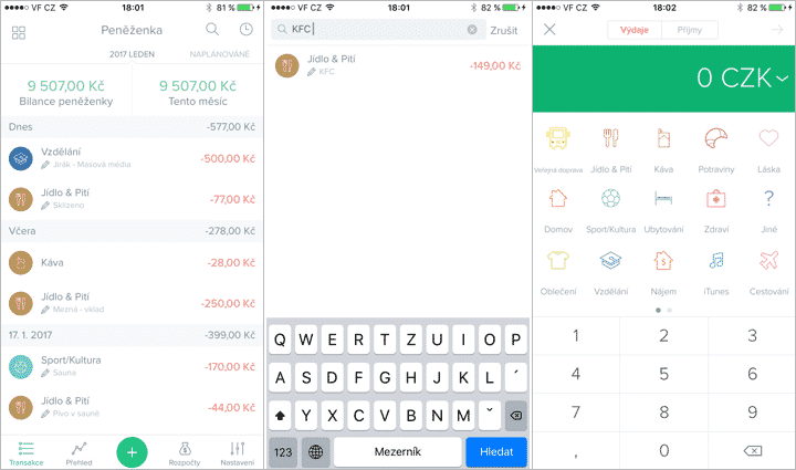 Aplikace dokáže navíc transakci zařadit do správné kategorie, tedy zda se jedná například o jídlo, jízdenky nebo novou kabelku. U bezplatné verze aplikace máte možnost vytvořit si až tři účty. (např. hlavní bankovní účet, spořicí účet a investice).