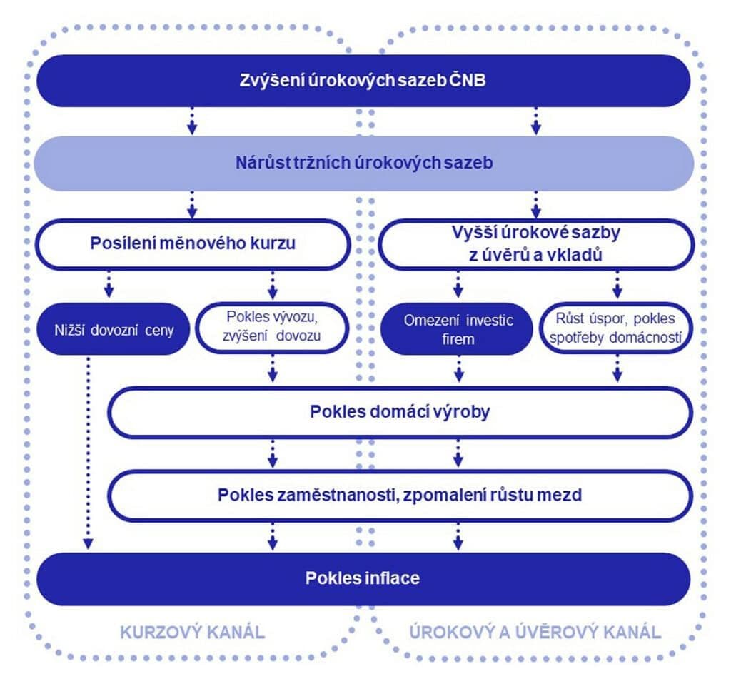 Měnová politika je velice komplexní disciplína. Zjednodušeně ale lze říci, že pokud ČNB tyto sazby zvyšuje, bojuje sice s vysokou inflací, ale zároveň způsobuje, že je k dispozici méně peněz ve formě úvěrů. To má za následek, že lidé a firmy méně nakupují, méně utrácejí, a tím v souhrnu zpomalují růst ekonomiky.