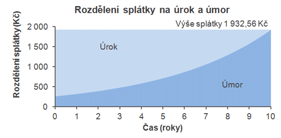 Typická splátka půjčky se skládá z úroku a úmoru. Úrok označuje náklady na půjčku, tedy poplatek, který si půjčovatel účtuje za její poskytnutí. Úmor označuje samotné peníze, které byli půjčeny. Důležité je uvědomit si, že ze začátku pokrývá valná většina měsíční splátky úrok a až během splácení se podíl úmoru v celkové částce zvyšuje, až ke konci už v podstatě splácíte čistě jenom úmor.