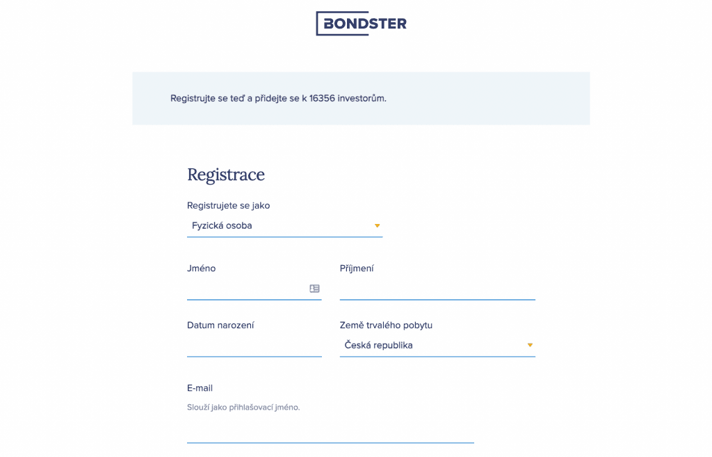 Registrace na platformě Bondster je nesmírně jednoduchá a nezabere vám více než 5 minut. Celý proces probíhá výhradně online a vyhnete se jakémukoli papírování.