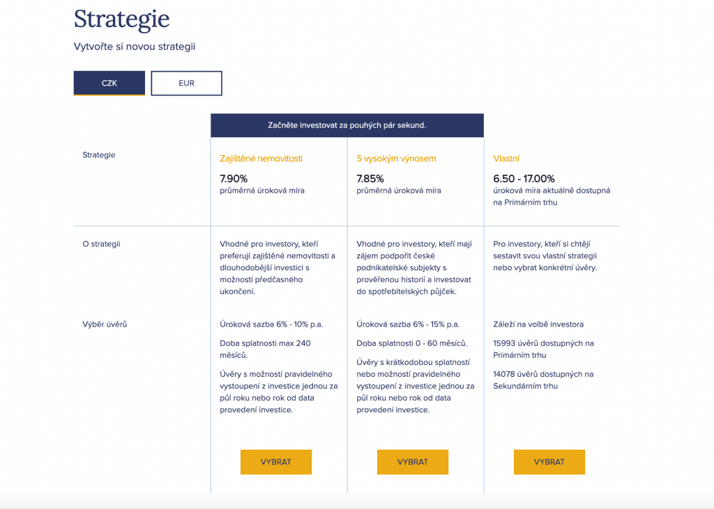 Korunové tržiště je bohužel v celku omezeno s limitovaným množstvím poskytovatelů. Na tržišti v eurech naleznete více poskytovatelů, a zároveň i vyšší výnosy. Největší výhodou však je, že na eurové tržiště se nevztahuje 1% roční poplatek.