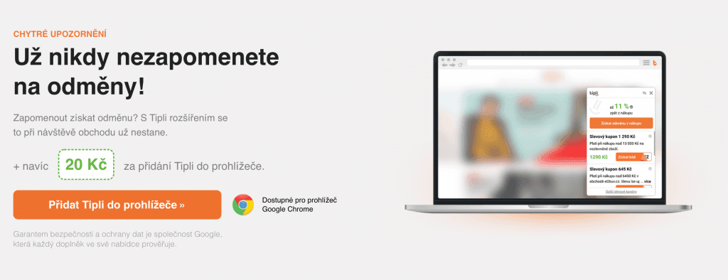 Závěrečný tip od Financera.cz je nainstalovat si také Tipli rozšíření do vašeho webového prohlížeče. Výhodou tohoto rozšíření je, že vás vždy upozorní navštívíte-li partnerský e-shop. Nikdy se vám tak už nestane, že byste zapomněli využít možnosti získat cashback od Tipli.