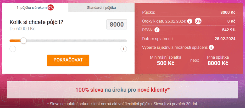 Jste-li nový zákazník, můžete si zcela bez poplatků půjčit od 1000 do 16 000 Kč. Stálí zákazníci si mohou půjčit až do výše 60 000 Kč, ale už s poplatky. Pro přesměrování na online formulář se žádostí o půjčku klikněte sem.