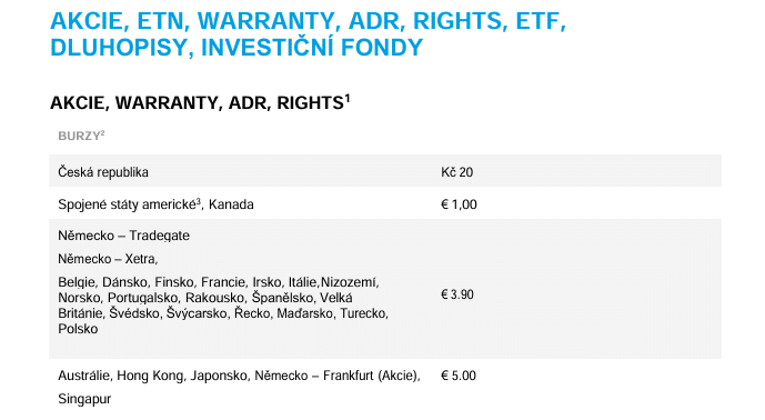Při nákupu akcií **na pražské burze tak můžete nakoupit s poplatkem 20 korun, **na ostatních evropských burzách je již poplatek 3,90 eur. Za standardní nákup ETF fondů zase zaplatíte jednorázový poplatek 2 eura.