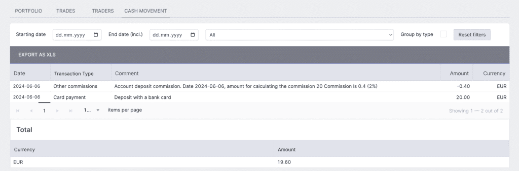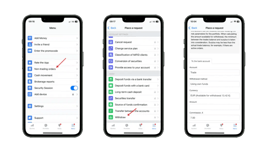 Freedom24 má fixní poplatek 7 €/7 $ za každý výběr. To je skvělé, pokud plánujete vybírat jen zřídka a jen větší částky, protože paušální poplatek se s výší částky nemění. Pokud však patříte k lidem, kteří provádějí mnoho peněžních vkladů a výběrů z investičního účtu, tento poplatek značně sníží konečný výnos z vašich investic.