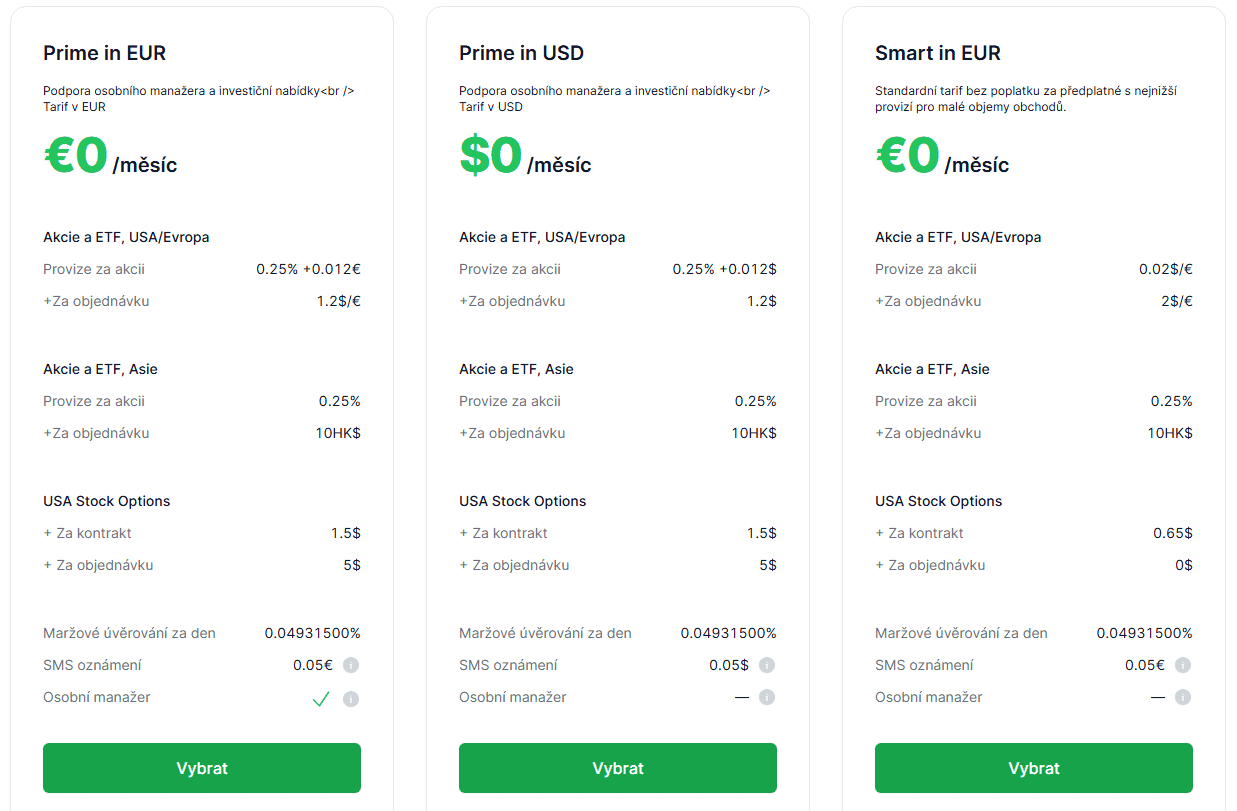 | Provize, na jednu akcii | 0,02 € + 2 € za transakci (v tarifu Smart v €), 0,5% z hodnoty transakce + 0,012 USD za každý kus + 1,2 $ za transakci (v tarifu All inclusive v USD) |