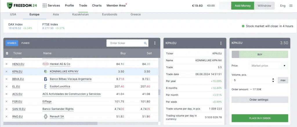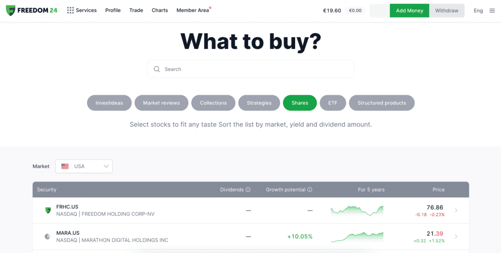 Platforma nemá k dispozici frakční investování do akcií. Freedom24 je seriózní broker, který vám poskytne plný přístup k aktivům, s nimiž obchodujete, a ne pouze k jejich CFD. To znamená, že si musíte koupit celé akcie, pro které se rozhodnete, a nemůžete obchodovat pouze s jejich částmi, jako je tomu u jiných konkurentů v oboru.
