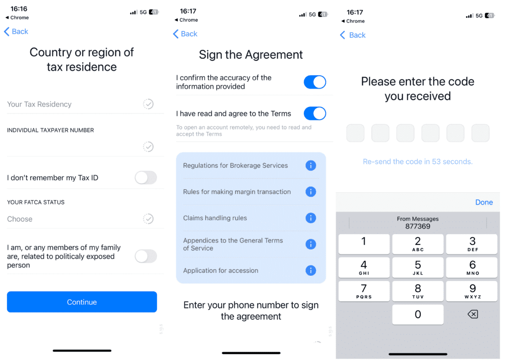 Musíte vyplnit údaje týkající se zdanění, země bydliště a prohlášení, že nejste politicky exponovaná osoba.